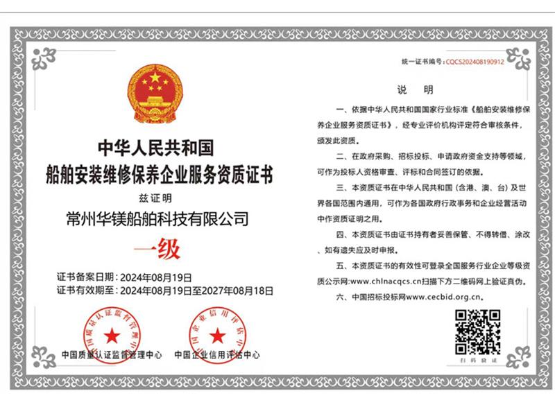 船舶安裝維修保養(yǎng)企業(yè)服務(wù)資質(zhì)一級(jí)證書